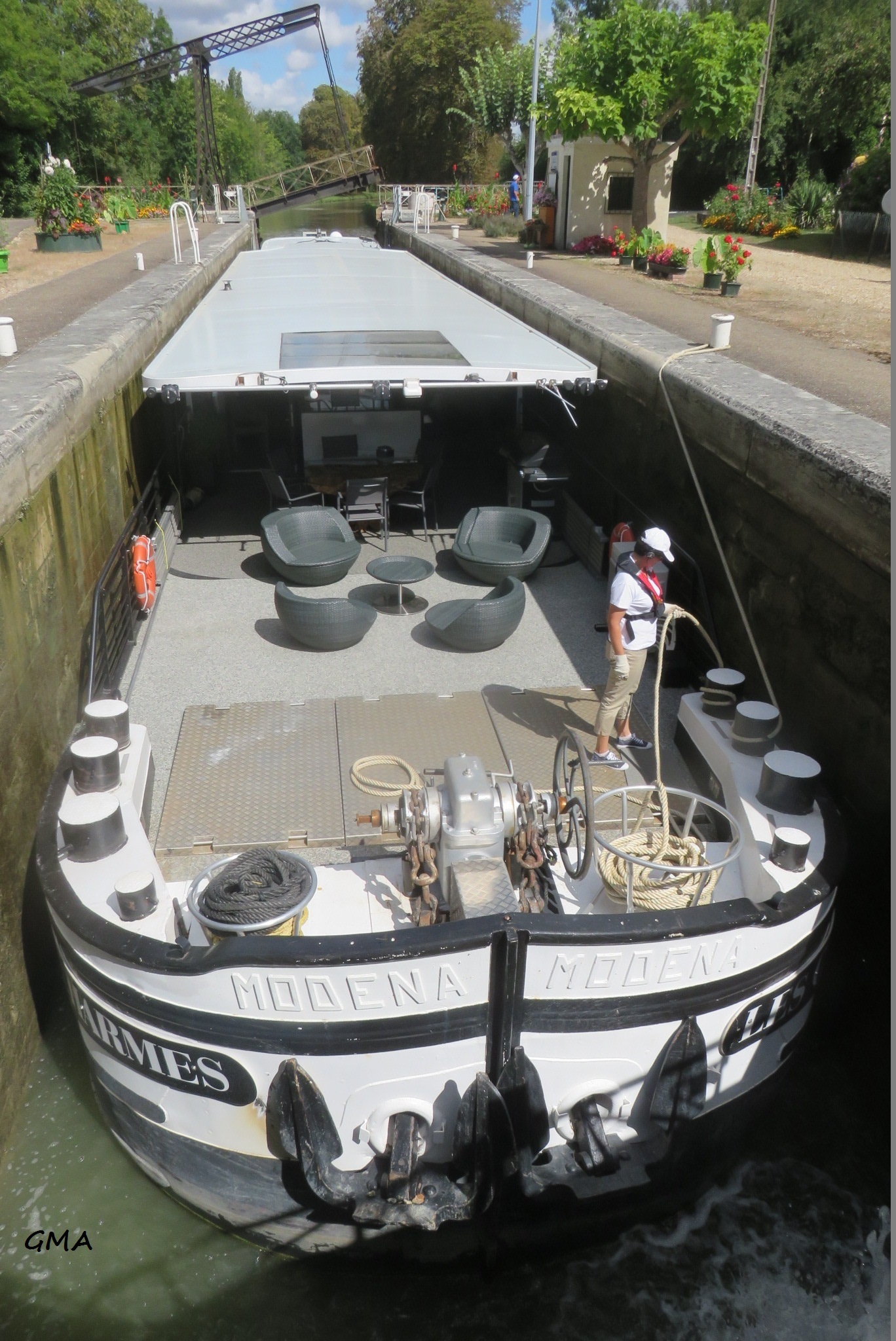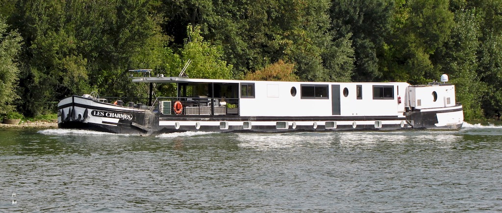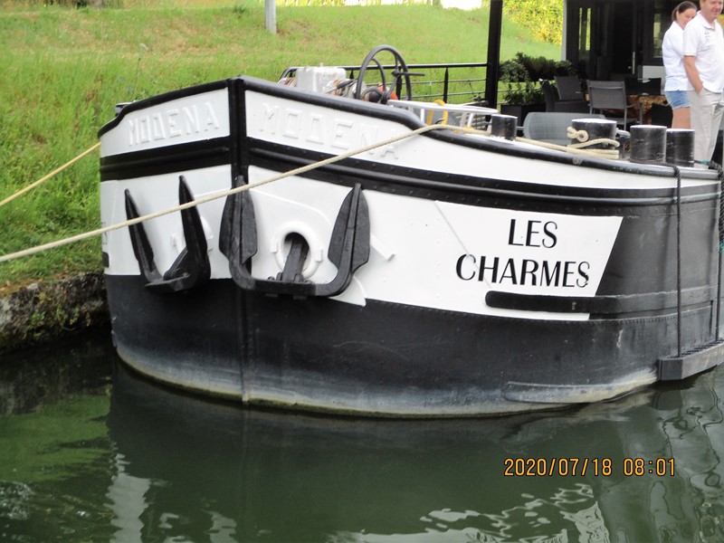 Bonne nouvelle Il a repris du service comme futur bateau hotel (les travaux sont en cours de finitions).Sa nouvelle devise:LES CHARMES. L ancienne devise MODENA est encore écrite dessus sinon je ne l aurai pas reconnu.les plat bords ont été baisse de 20 cm,l ancien logement relevè d une trentaine de cm et l ajout d un deuxième étage font qu il est difficilement reconnaissable.Il a garde l ancien matricule avec un zéro devant.Ils ont aussi mis un deuxième moteur sur le cote