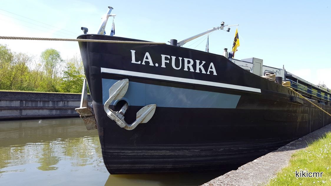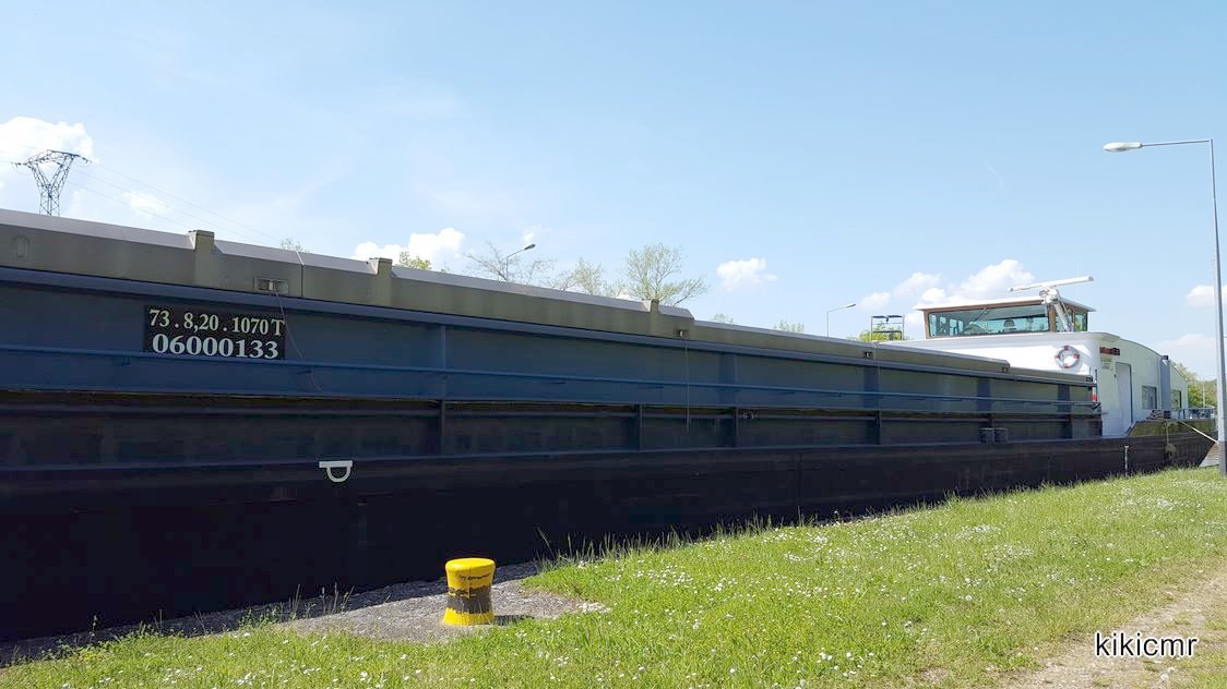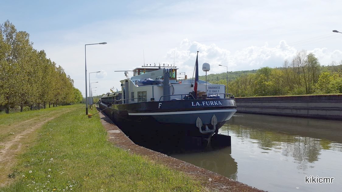 Il navigue maintenant sur le bassin du Rhin, le voici amarré au-dessus de l'écluse de Blénod-les-Pont-à-Mousson (54) le 7 mai 2016 :