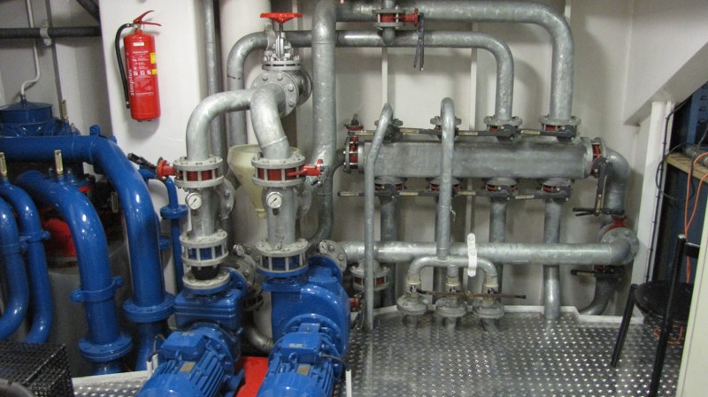 les pompes de ballast avec la tuyauterie pour allimenter tous les compartiments du bateau