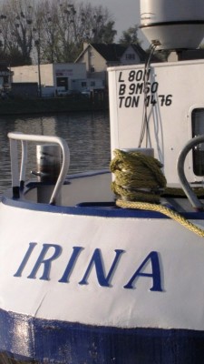 Suite au peintures fini récemment, I'Irina arbore sur le arriere tribord du logement , son port d'attache avec plein d'histoire marinière;-