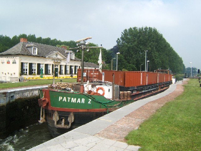 Le Patmar Z, de type Campinois, sort de l'ecluse de Kampenhout.Il est avalant. Notre ami Kurt en sait plus long sur l'origine du bateau et je lui laisse la parole s'il veut.