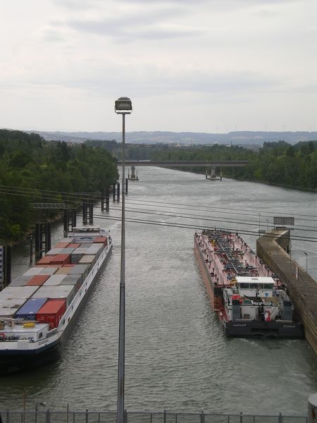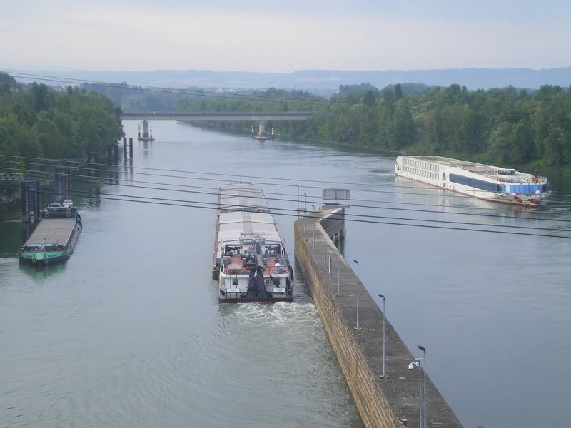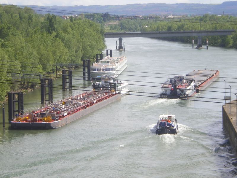 Avant 1976 (mars),je connaissais du Rhone, juste ce que l'on m'avait appris a l'ecole. Donc, il est vrai qu'avant cette periode,je ne parlerais pas du sujet.Mais a Paques 76,j'etais matelot,sur le Simbeu (le plus beau pousseur de la Sogestran),nous avions embarque a Beaucaire et nous sommes venus a Andance.Sablons etait en construction, et la nous sommes reste trois (3)mois,a Andance, toute la flotte du Rhone etait la.A savoir les Citerna,les Rhodania la Sogestran (2 pousseurs) et tous les Artisans.Tous les matins le Cdt,allait au info,sur le debit a venir et les "lacher" d'eau de la part des Suisses. il est vrai, nous n'etions pas les bienvenus,avec nos pousseurs.Meme dans les commerces a Andance,l'on sentait tres bien la preference pour la flotte classique.Nous (la Sogestran) avait a cette epoque trois barges: Rouen, Paris, le Havre, des hydros,le seul trafic etait pour le port petrolier de Givors, du noir(fuel lourd) Donc des qu'il y avait des lachers en vue,la moralite etait d'etre dans les premiers,afin de beneficier de l'eau,car l'on (les Suises) ne s'occuper pas des boots passer et de ceux qui etaient pas encore passe,des que le debit annonce etait passer,ils fermaient et au prochain tour.Je me souviens,qu'un coup nous etions monte avec le Brau et une barge sur 4 ou 5 km,et nous avons du faire le meme trajet en reculant ,donc le passage du pont de Peyraud,la passe n'etait pas tres large.Sinon,je vous garantie que le Simbeu,avec une barge a 1,80 ou 2 m d'enfoncement et 3000 ch,dans les biefs "ca marchait" surtout qu'a l'epoque malgres la crise de 74,s'etait le renouveau sur le Rhone et il fallait le montrer.A savoir que l'Emperi et le Riaume marchaient beaucoup mieux que nous,en plus ils avaient des barges bien faite et non taillait a la cerpe.Je dois avoir des photos dans mes archives. A cette epoque les Canadiens etaient des gros bateaux, il y avait aussi qqs petrol de 1000 t,sinon le reste, des petites unites.