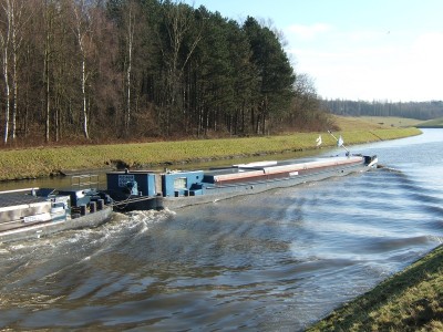 Des fois il navigue en isolé juste devant ou juste derrière son pousseur aussi, sur le petit gabarit, mais lors de ce voyage de Château-Porcien (08) pour Dunkerque avec de l'orge il était resté amarré à Arleux, on a donc cette photo étrange de la barge qui regarde passer son pousseur