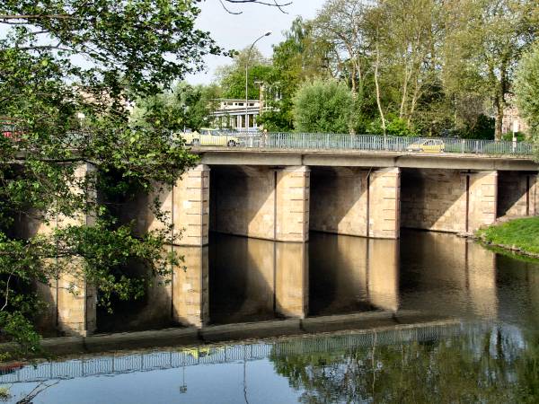 Le Pont de l' écluse a saarlouis , ouvrages édifiés entre 1682 et 1684 ;la fermeture de l'écluse permettait d'elever le niveau de la Saar et de noyer la campagne environante pour stopper d'eventuels envahisseurs.