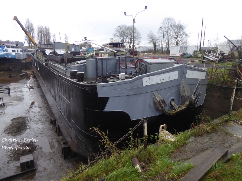Sa nouvelle vie de bateau-logement : il est en cours d'aménagement au chantier Miclo, à Dombasle ; il y a quelques semaines, il a été ballasté avec des traverses en béton, et dans la bordaille, sur le côté qu'on ne voit pas sur les photos, il y a des trous...