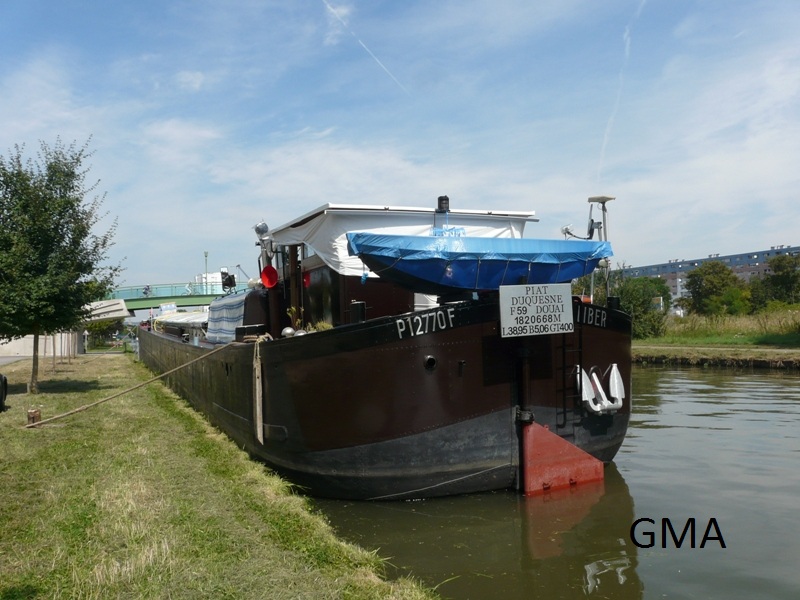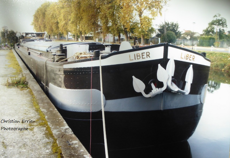 Un petit bateau de plaisance portant le nom de Liber cherche a accoster au silo près du chantier naval