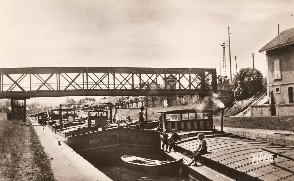 Nous voici à l'écluse de Pont-sainte-Maxence, dans laquelle on trouve un bateau de la Compagnie de Matériel et de Transports par Eau, dont le siège se trouvait 4 rue des Célestins, à Paris (4e) et dont le directeur était, au moins en 1957, M. LAMY :