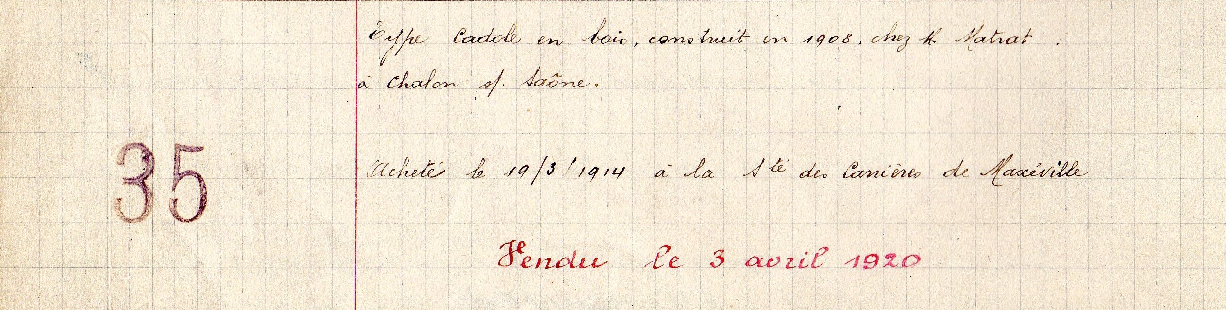 Le matricule n'est même pas mentionné. Il s'agit d'un bateau type cadole en bois, construit en 1908 chez M. Matrat à Chalon-sur-Saône, acheté en mars 1914 et revendu en avril 1920.