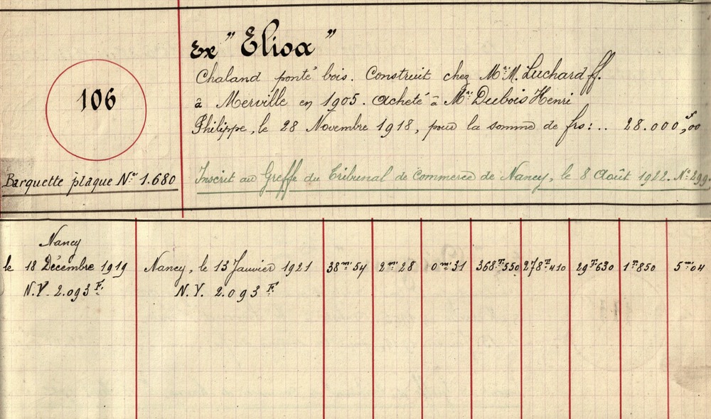 Jaugé à Nancy le 18 décembre 1919. Immatriculé à Nancy le 13 janvier 1921 sous le numéro NY2093F. Plus grande longueur gouvernail non compris : 38m54. Hauteur maxima : 2m28. Tirant d'eau à vide : 0m31. Tonnage à charge complète : 368t550. Tonnage à 1m80 : 278t410. Tonnage à vide : 29t630. Tonnage par centimètre : 1t850. Largeur : 5m04.