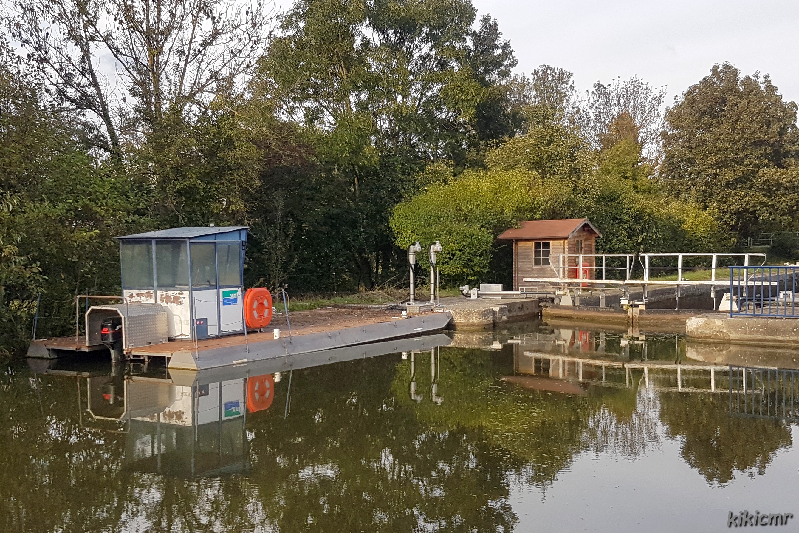 Un engin flottant de VNF, amarré à l'amont de l'écluse n°29 d'Heidwiller (68), sur le canal du Rhône au Rhin :