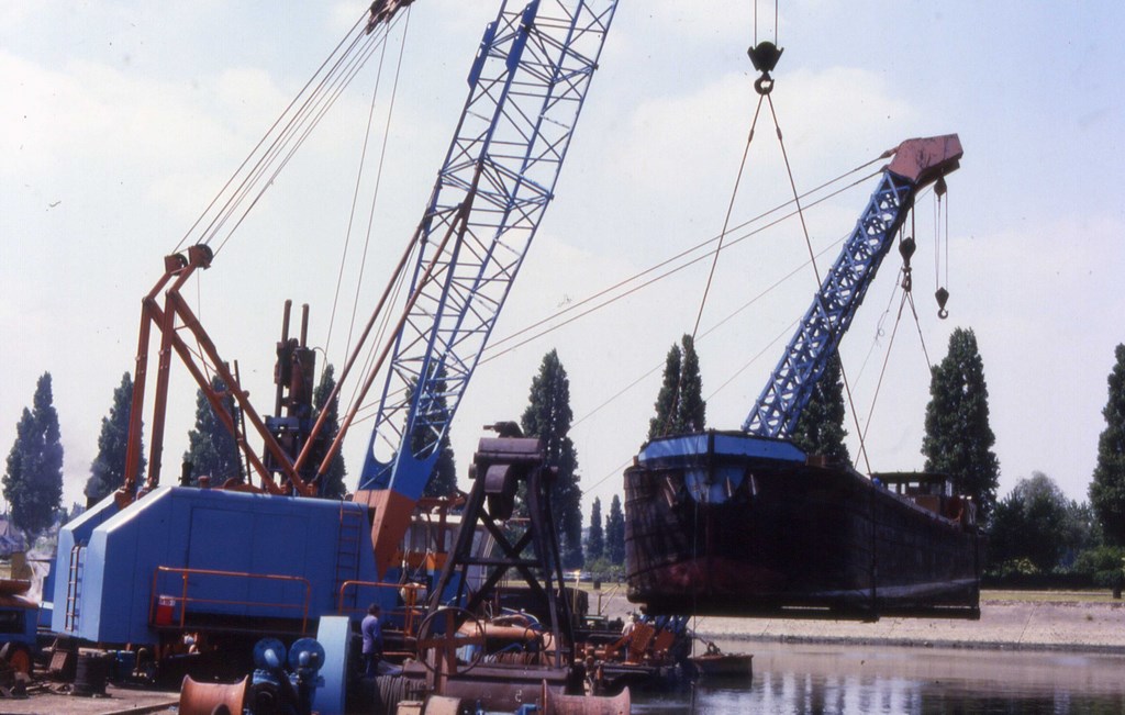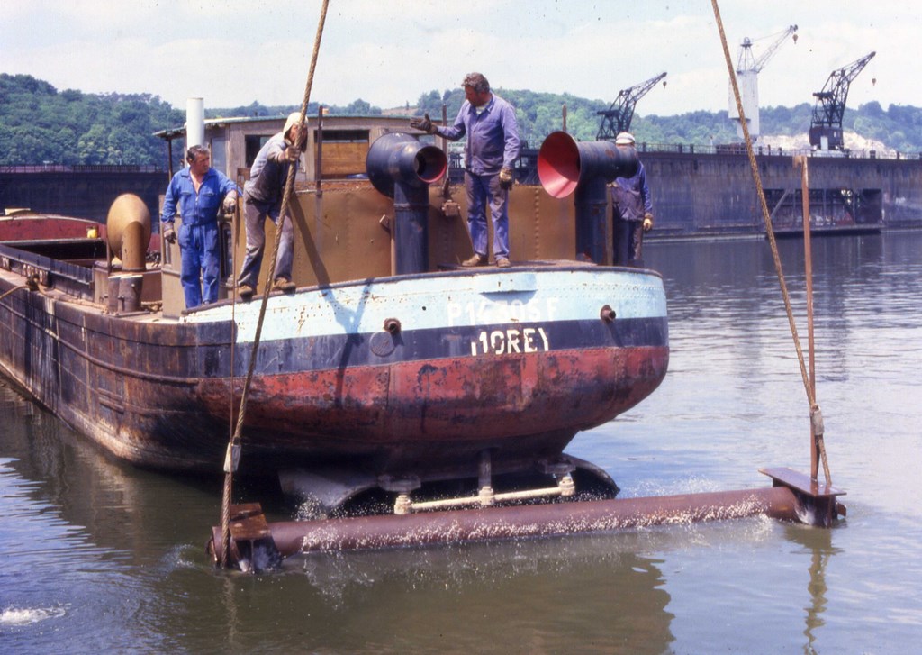 Le bateau qui avait été acheté par l’exploitant d’une tourbière de Heurteauville a été mis sur une barge, à l’aval de Rouen à l’aide d’une grue et d’une bigue, avec la partie avant qui dépassait de la barge.