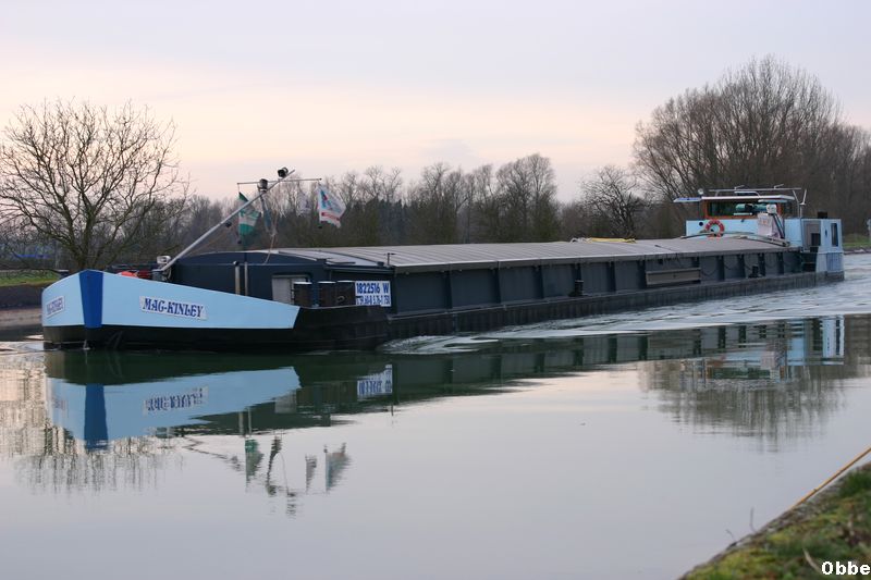 Mac-Kinley , 59,60 x 5,76 x 2,90 , 750 ton , Bouwjaar 1948 , Werf Jerrikan in Dunston ( Groot-Brittannië ) , 275 pk Detroit , ex Suda , ex Aurobruno , eigenaar Christian Bernard in Parijs , ENI 01822516
