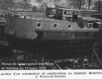 On apprend dans "Revue de la navigation intérieure et rhénane" du 10 juillet 1958 quelques informations concernant le travail du chantier Mourlon de Pierre-la-Treiche pour le renouvellement du parc fluvial français, avec la "série Nancy" de la SRPF, appelés "mixtes" par les mariniers : l'avant et l'arrière construits par la société Leffer, la partie centrale et l'aménagement réalisés par les chantiers Mourlon et Broutin : l'article d'Henry de Goriainoff, ingénieur civil du Génie maritime, est à retrouver ICI.