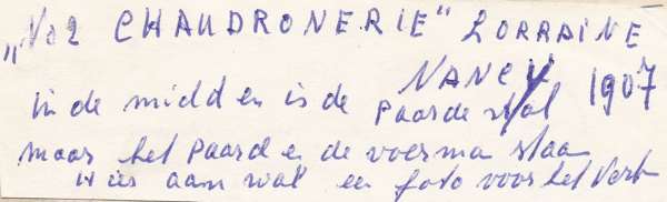 Cette carte-photo a été écrite par Gaston Feneuil (ou Teneuil) et postée à Neuves-Maisons le 11 septembre 1907, elle est destinée à son ami Emile Geemens (si je déchiffre bien), au 124 rue de Naples, à Anvers. Arrivée le 12 septembre, d'après le deuxième timbre à date. La correspondance ne nous apprend pas grand chose, à part que Gaston et sa famille sont toujours en bonne santé...