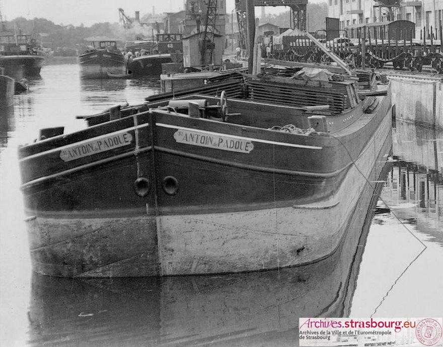 KITTEL V serait l'ancien SAINT-ANTOINE-DE-PADOUE construit en 1928 au chantier Pauli de Strasbourg. Alors j'ai comparé et je trouve que le nez du bateau sur la photo de Strasbourg ressemble au nez du KITTEL V de la CPSM de Sarrebruck, et j'ai aussi regardé d'autres nez de Pauli de la même époque qu'on a déjà sur le forum et ça semble correspondre, voilà pourquoi je publie cette image ici.