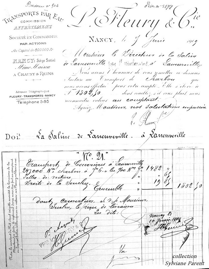 Très intéressant ! C'est vrai que les bateaux de la flotte Marcheville-Daguin avaient une devise du type N°xx, mais là, ce n'était pas ça. C'est une flotte publique de Nancy, L. Fleury et Cie, dont le bateau N°21 a fait un voyage de charbon entre Courrières (Pas-de-Calais) et la saline de Laneuveville.