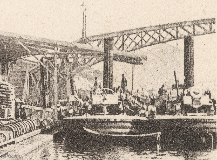 On peut voir, au premier plan, la péniche JEUNE GASTON, et devant elle, deux porteurs à vapeur ; suivant la date où la photo a été prise, ils appartiennent soit à la société Pavot Frères (disons que c'est si la photo date d'avant 1904 environ), soit aux Messageries Fluviales de France (si la photo est plus récente, sur une période s'étalant de 1904 à 1908 environ) ; le premier n'est pas identifiable, mais on voit bien la devise de celui qui est à l'arrière-plan, c'est le