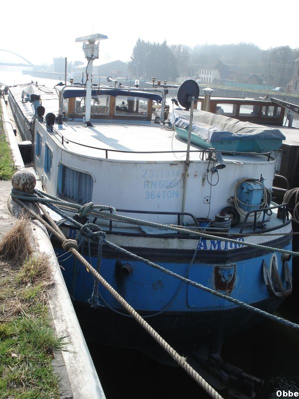 J'étais sur le qui-vive depuis qu'en début de semaine, un des informateurs que j'ai placé régulièrement le long du canal m'a averti du passage d'un AMIGO chargé de blé pour Strasbourg. Et il se trouve que c'est ce dimanche midi qu'il a choisi pour redescendre... Je viens de le retrouver à Dombasle, occupé à s'amarrer à la goulotte de la Solvay :