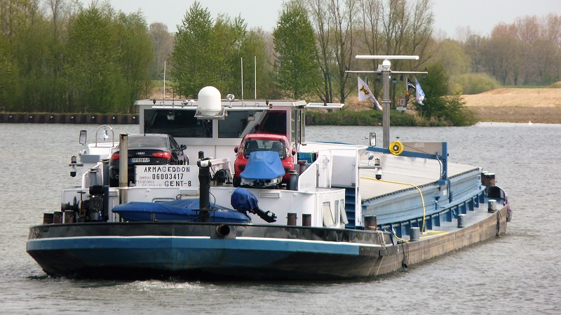 Armageddon , 85,85 x 9,46 x 2,73 , 1427 ton , Bouwjaar 1958 , Werf Arminiuswerft in Bodenwerder ( Duitsland ) , 680 pk Caterpillar en 170 pk GM boegschroef , ex Mauritsweg , ex Lehnkering 74 (Amsterdam) , ex 3 x Dongestroom , ex Kirsten , ex Kirsten , eigenaar J.Barron en F.Duvinage in Gent , ENI 06003417