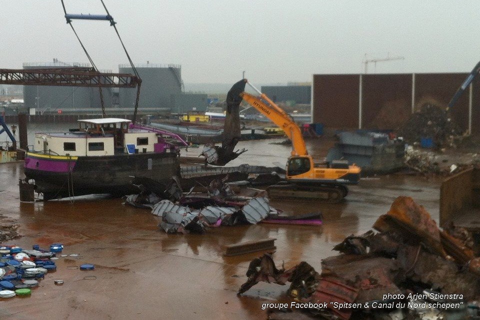 J'ai pu voir cette photo publiée par Arjen Stienstra, qui a été capitaine sur le TESCO 4, dans le groupe Facebook Spitsen & Canal du Nord schepen : le bateau au déchirage en décembre 2012 à Kampen (NL)