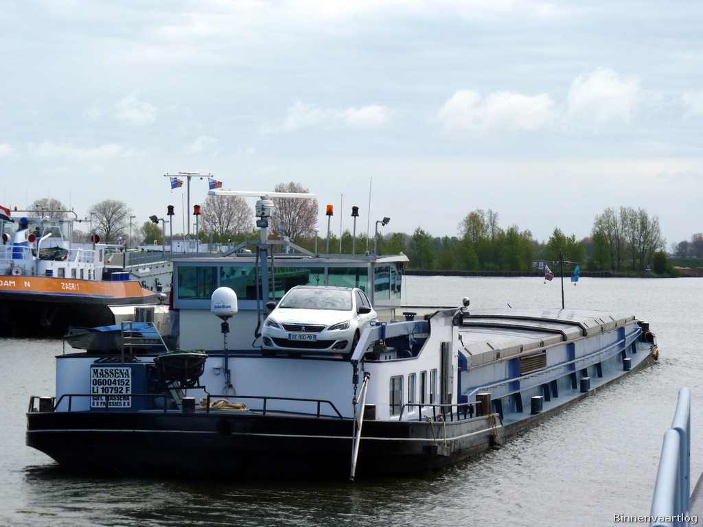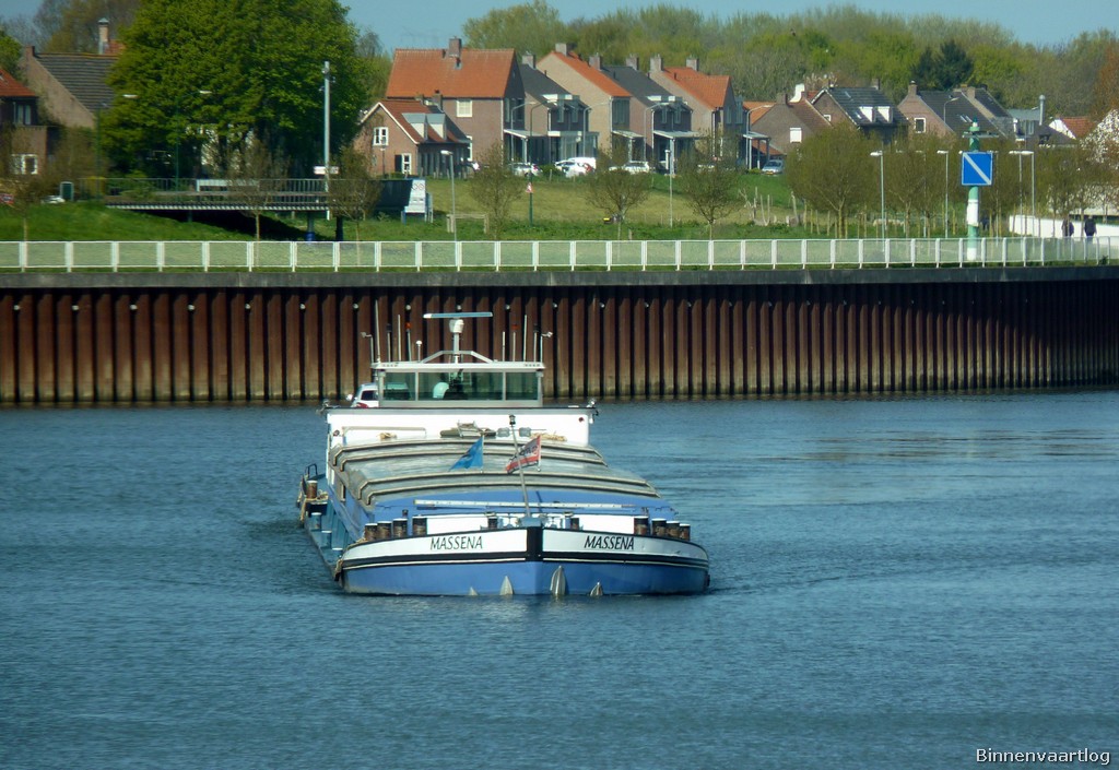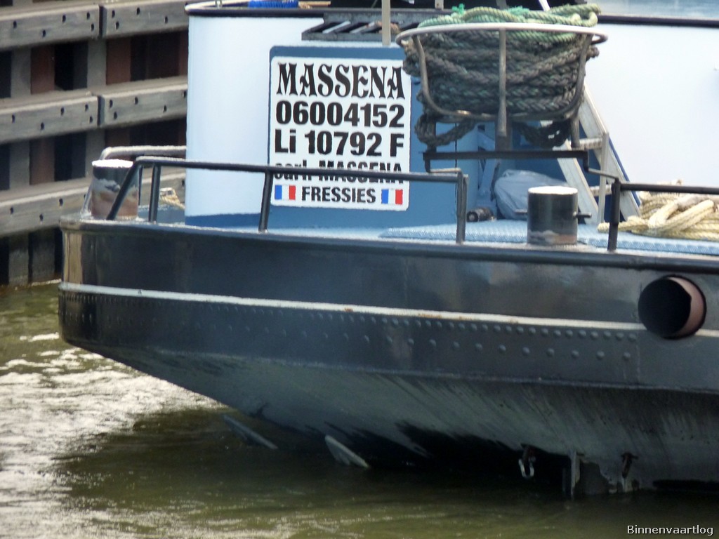 Massena , 79,73 x 8,20 x 2,52 , 1123 ton , Bouwjaar 1959 , Werf Cassens in Emden ( Duitsland ) , 860 pk Mitsubishi en 200 pk DAF boegschroef , ex WTAG 40 , ex Wilhelm Höfer , ex 2 x Adrianus-V , ex Okinawa , ex Gaele , eigenaar Sarl Massena in Fressies , ENI 06004152