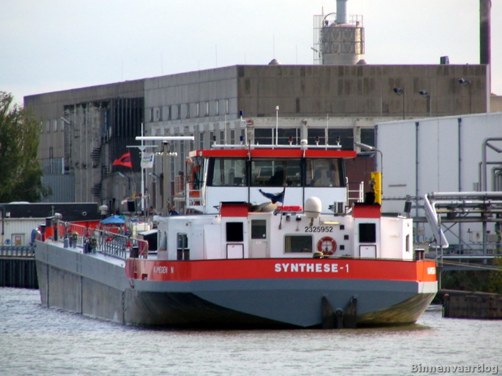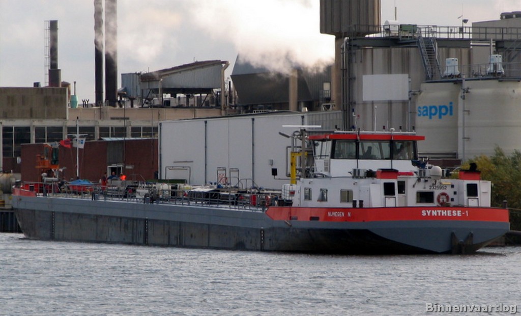 Synthese 1 , 85,88 x 11,40 x 3,27 , 2005 ton , Bouwjaar 1998 , Werf H. Grube in Hamburg ( Duitsland ) , 1414 pk Cummins , ex Synthese , ex Synthese 1 , eigenaar Nijmegen BV in Nijmegen , ENI 02325952.
