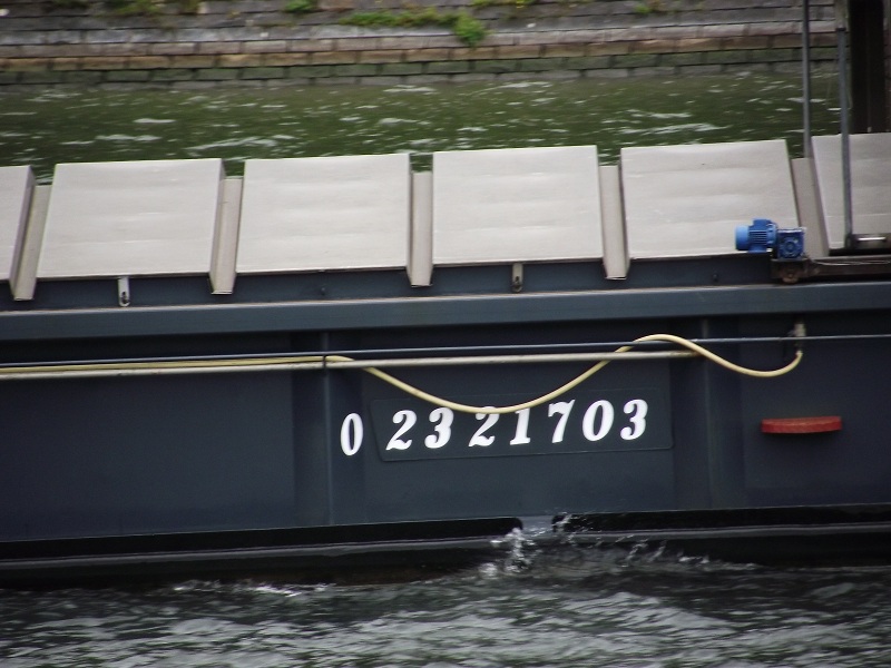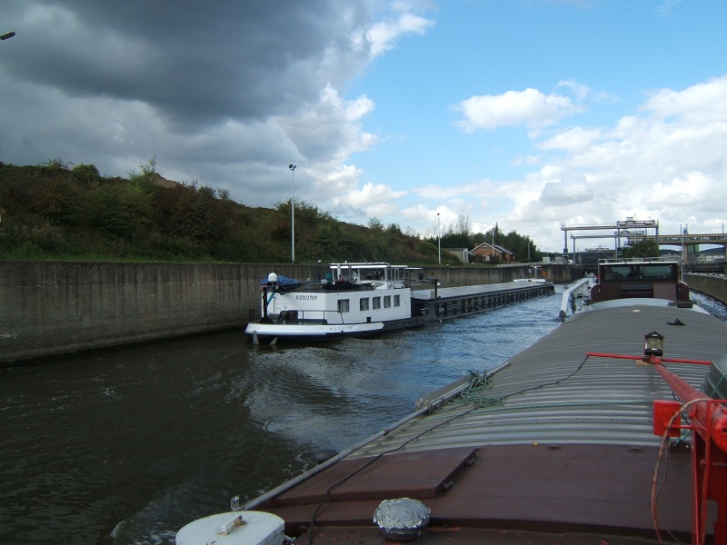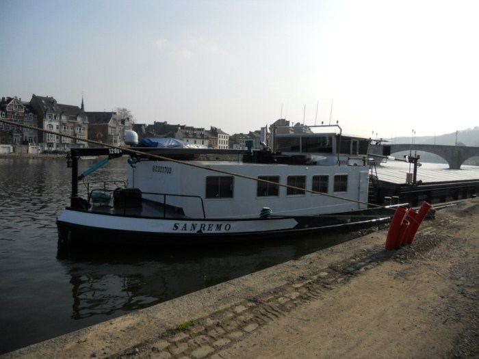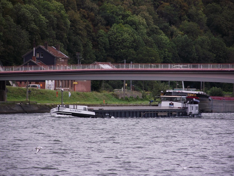 A la même écluse de Floriffoux sur la Sambre, le Pareatis croise le SAN REMO ex Conspiro, ex Conolia, ex Candia, ex Donau Maru; construit en 1954 au chantier J.G. Hitzler à Lauenburg en Allemagne; 80 x 8,25 m. et 1146 T.