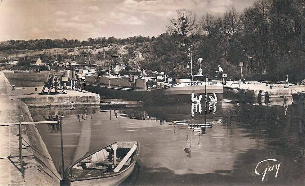 LARREY ecluse n°54 amont DIJON ce bateau appartene AU DEPOT MELIN ET HOUGUENAGUE et il y avait aussi le HOULIN un jerrycan qui ne faisait que le depot de tonnerre un jerrycan ne peut travercer le canal de bourgogne, avec le ROMANA en 1952-54 nous travaillons avec ces btx
