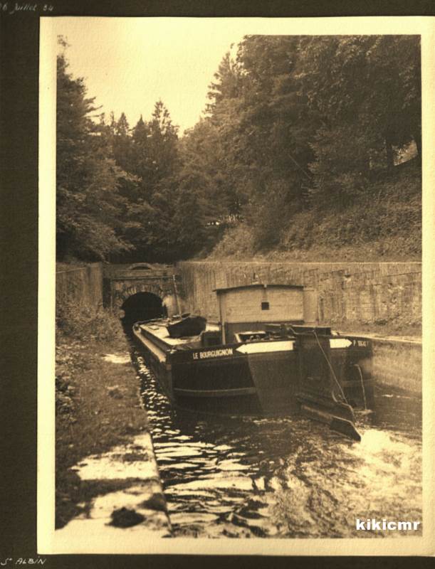 Photo d'un bateau de la CANAL (Compagnie Auxiliaire de Navigation d'Alsace-Lorraine), extraite d'un album se rapportant à une navigation sur la Saône en 1934, ici à la voûte de Saint-Albin :