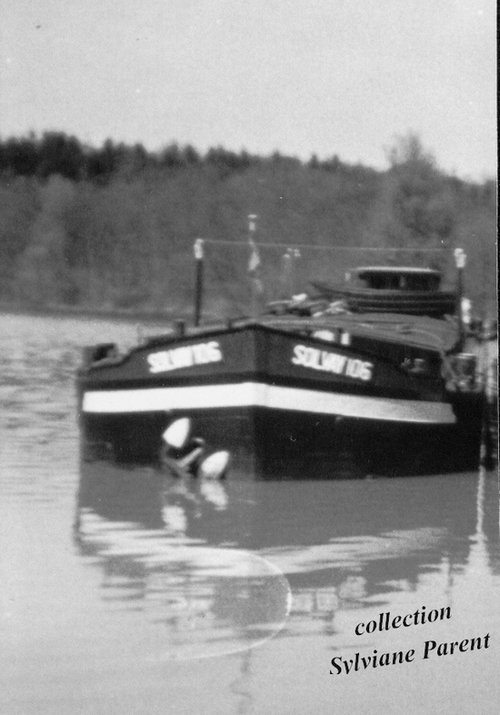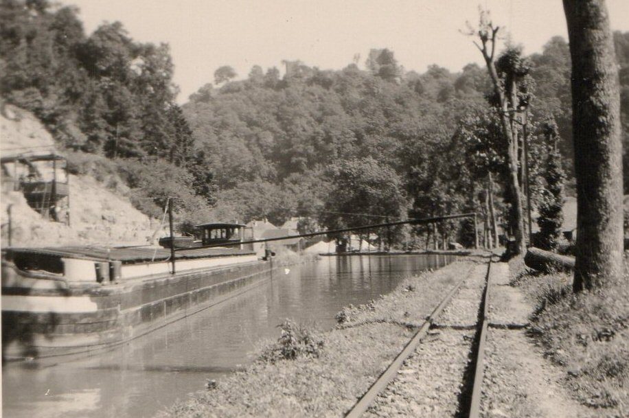 On voit qu'il sert à la construction d'un pont de bateaux ; la photo n'est pas datée, mais on peut penser qu'elle a probablement été prise en mai ou juin 1940. Pour la localisation, il y a une légende manuscrite au dos ; j'ai un peu de mal à la déchiffrer, mais il me semble que c'est écrit "auf die (ou der, ou das, ou dem, ou den, ou autre) Mosel", ce que mes longues années d'apprentissage scolaire de la langue de Goethe me permettent de traduire par "sur la Moselle". J'espère que quelqu'un reconnaîtra l'endroit... Et peut-être que quelqu'un d'autre, ou le même, ce n'est pas gênant, reconnaîtra le remorqueur...