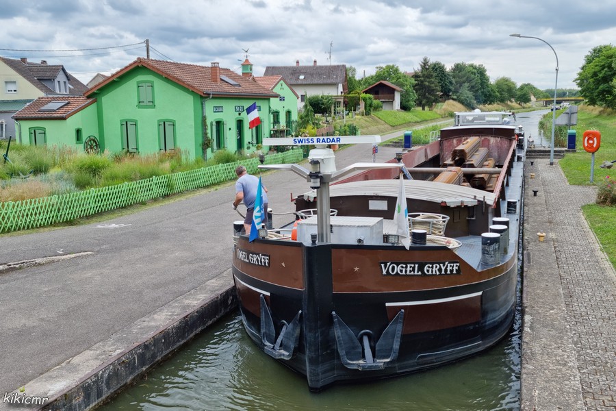 - en avril 2022, il était monté à Mulhouse sur le chantier d'aménagement du square de Gaulle en face de la gare SNCF où il évacuait les déblais du chantier vers le port de l'Île Napoléon ; le voici avalant dans la seule écluse du trajet, la 41 du canal du Rhône au Rhin :