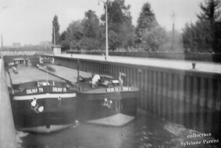 Et en plus, ce petit Solvay sorti des Chantiers Navals franco-belges de Villeneuve-la-Garenne, figure sur une jolie CPSM du canal de la Marne au Rhin, sur laquelle on le voit sortant chargé de l'écluse 22 du versant Marne du canal de la Marne au Rhin :