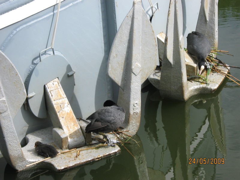 Je vous ai dit qu'il fallait parfois attendre pour décharger. Ce couple de foulques y a fait un nid et le petit est né.La tôle au soeil, une vraie couveuse.