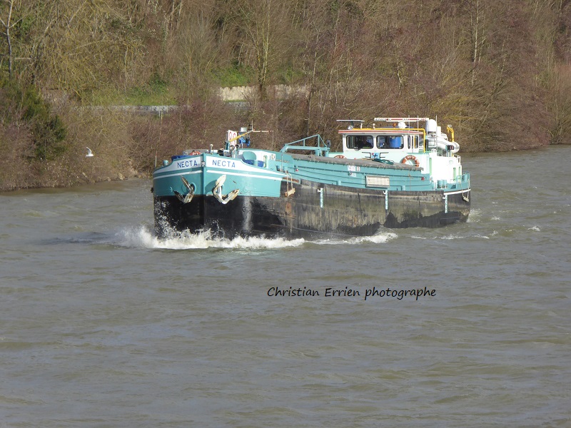 Le NECTA chargeant du malt à Herent, canal de Louvain, le 8/12/12. Il a bien été construit à Niel sur le Rupel (au lieu dit Hellegat) par le chantier "DEWACHTER-HUYS en Zonen" en 1943