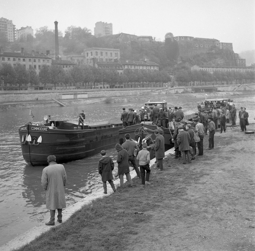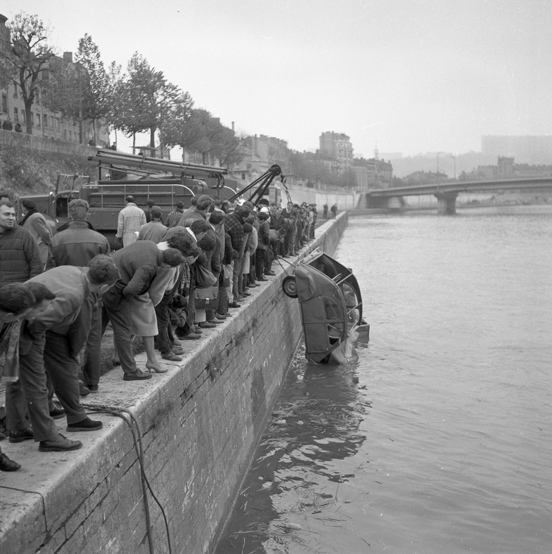A hauteur du quai Arloing les pompiers sont mobilisés. Deux bateaux (Commodore et ?) et une barque sont réquisitionnés pour tenter de remonter à la surface une Citroën 2CV échouée au fond de la Saône.