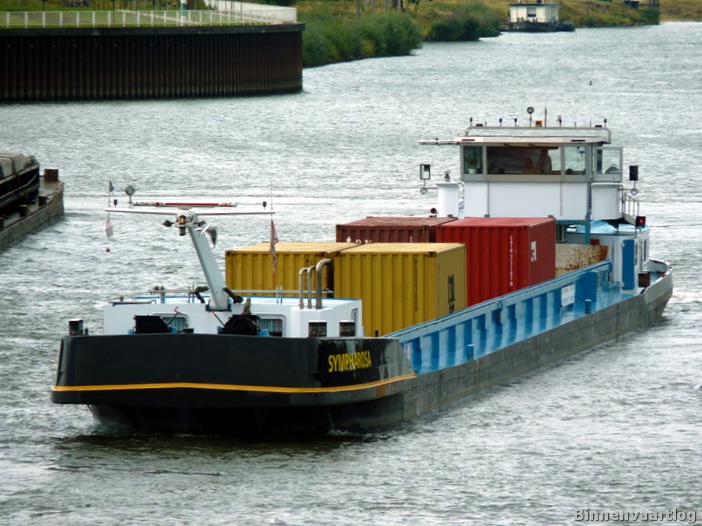 Sympharosa , 72,80 x 7,04 x 2,60 , 803 ton , Bouwjaar 1963 , Werf St. Pieter in Hemiksem ( België ) , 653 pk Mitsubishi en 320 pk DAF – van Tiem boegschroef , ex Aussenhafen , ex Karin , ex Harma , eigenaar Vof. MS Sympharosa (A. Haaima) in Terneuzen , ENI 02317043
