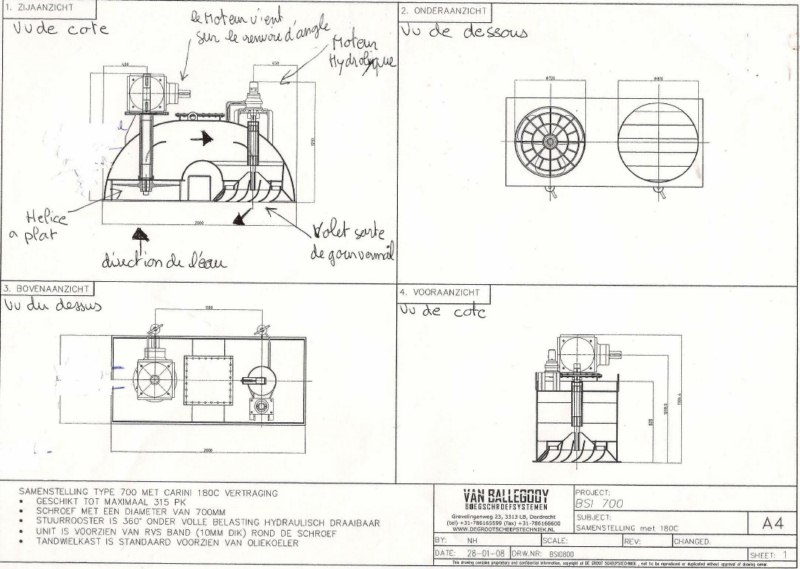 Les hélices a plats comme sur le BORNEO, on peut se s’en servir a charge comme a vide et aussi la ou il y a peut de profondeur sous le bateau. le principe très simple l’eau est aspirer puis guider dans un escargot ou tunnel puis ressort la ou on veut sur 360° a l’aide d’un volet ou gouvernail commander par un moteur électrique ou hydraulique a noter cependant que pour ce système la ou il est placé le bateau a vide doit être enfoncé d’environ 30 CM pour pouvoir s’amorcer