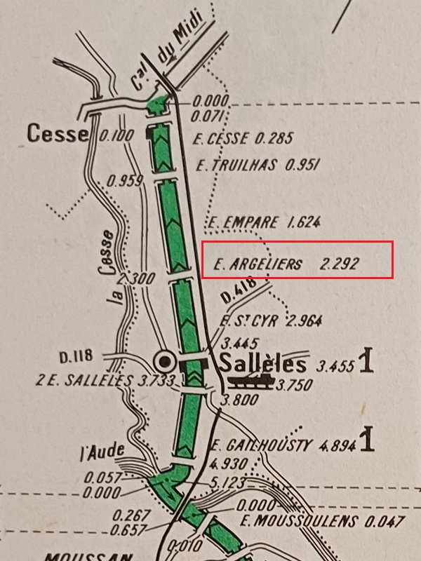 Le photographe est placé sur le pont de l’écluse d’Argeliers, voir le plan joint du Guide de la Navigation de Berger-Levrault, édition 1965.