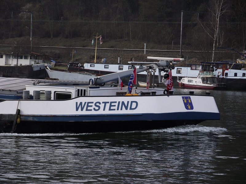Westeind , 86,00 x 10,00 x 2,97 , 1704 ton , Bouwjaar 1955 , Werf Hilgers in Rheinbrohl ( Duitsland ) , 1000 pk Wärtsilä en 430 pk DAF boegschroef , ex Rhein Ruhr 10 , ex Rhenus 120 , ex Leon B , ex Hanzestad , ex Franzozus-T , eigenaar Vof. Westeind (A. Aarnoudse) in Papendrecht , ENI 02314043