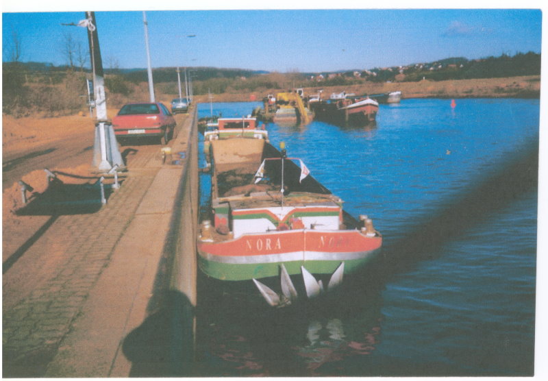 En 1991 Heinz Duhr avait acheté le NORA pour l`expansion de la Sarre. En 1991 et 1992 le NORA travaillait (avec le MARLON, RENA, ASKANIA, VIATOR et le FORTUNA) entre Luisenthal et Völklingen. On avait placé une auge dans les six péniches pour ce travail sur la Sarre.