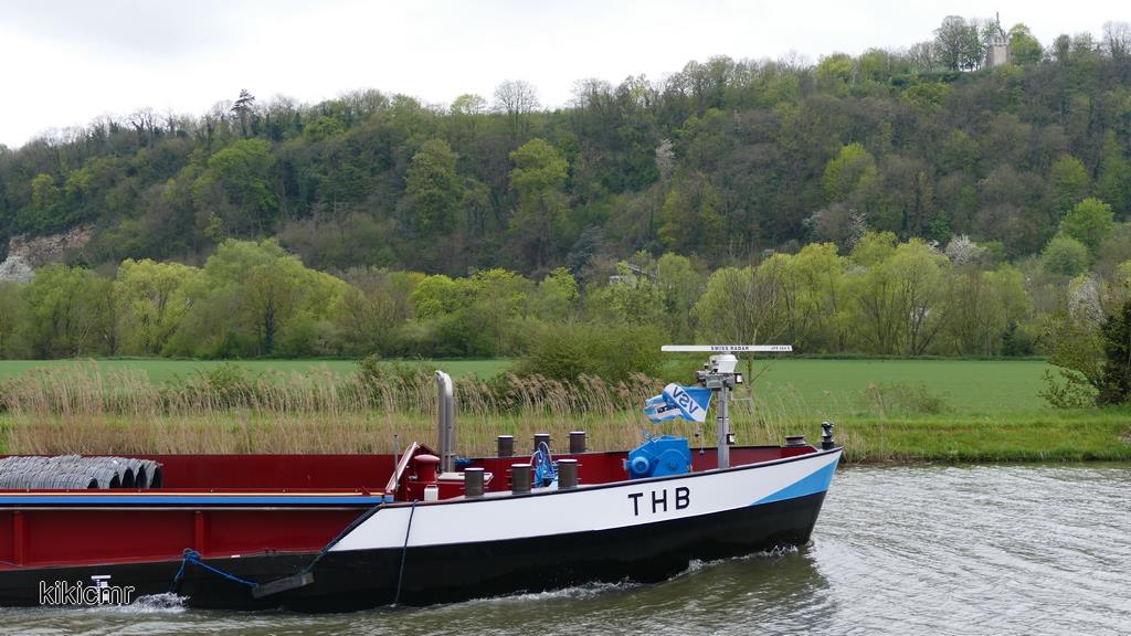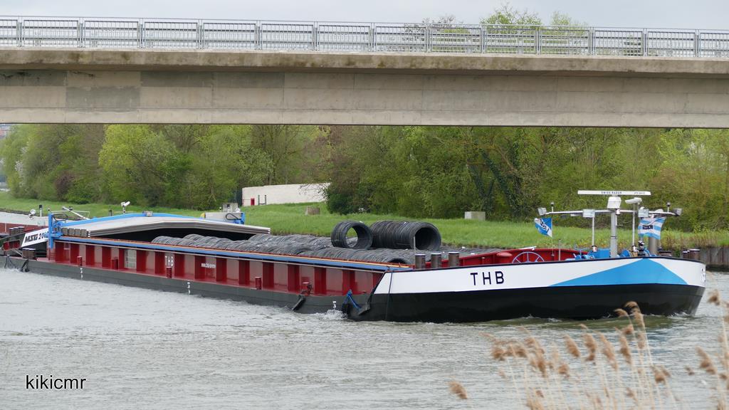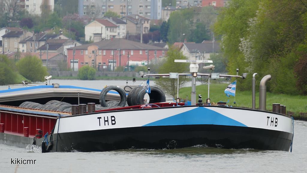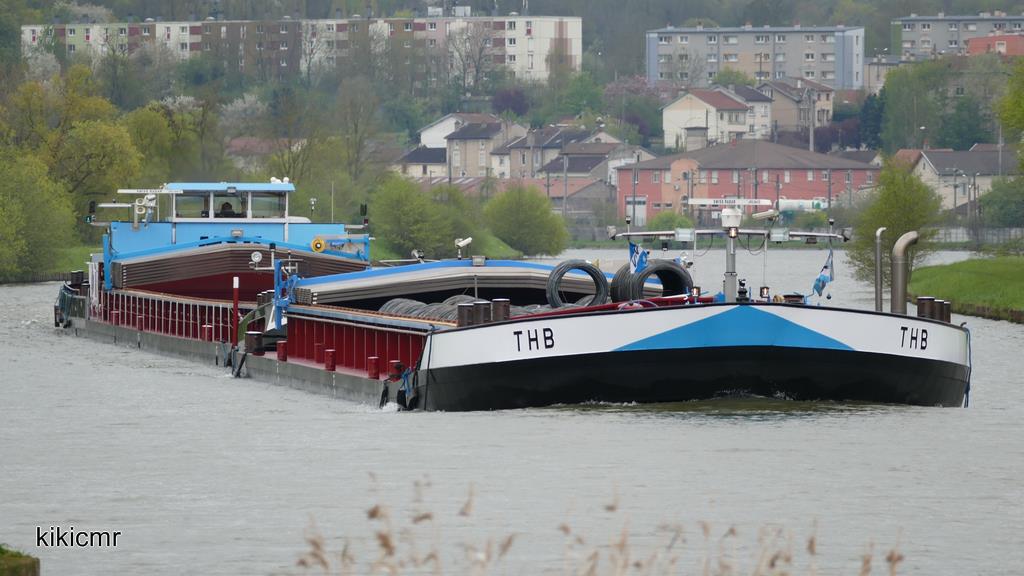 Vu sur la Moselle canalisée à Dieulouard (54), venant de Neuves-Maisons chargé de fil-machine, en convoi avec l'automoteur-pousseur
