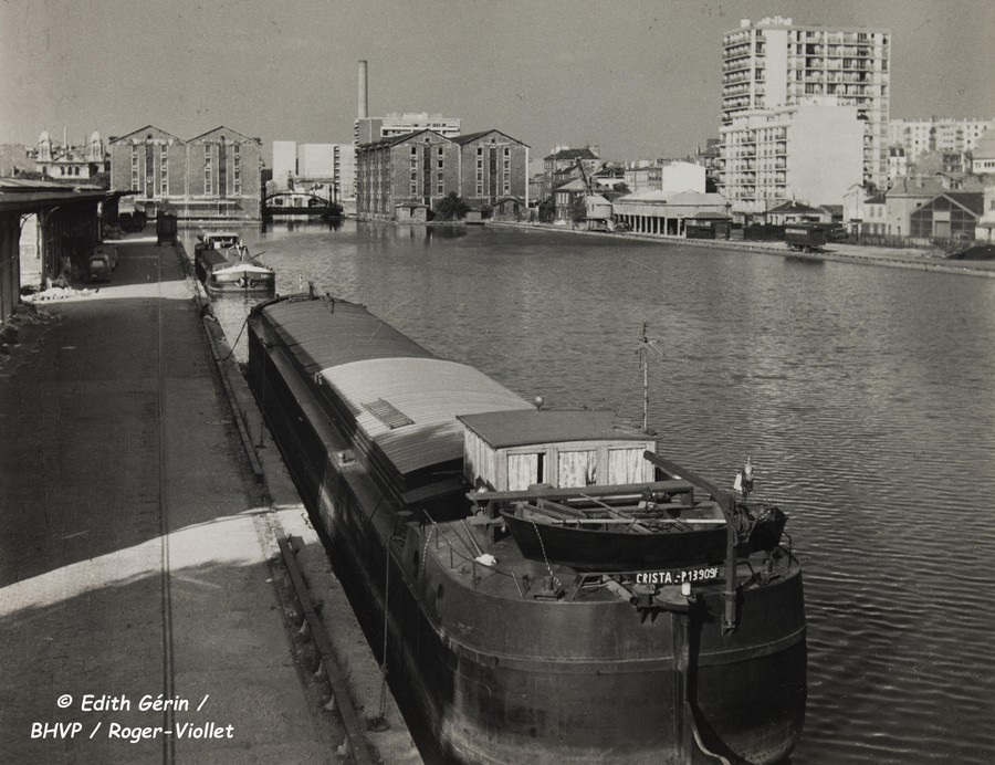 Sur le site bibliotheques-specialisees.paris.fr, portail des bibliothèques municipales spécialisées, on trouve cette photo d'Édith Gérin, conservée par la Bibliothèque historique de la Ville de Paris, dont le titre est : "Paris. Quai de la Loire et quai de la Seine. Bassin de la Villette et Magasins généraux", de 1960 :