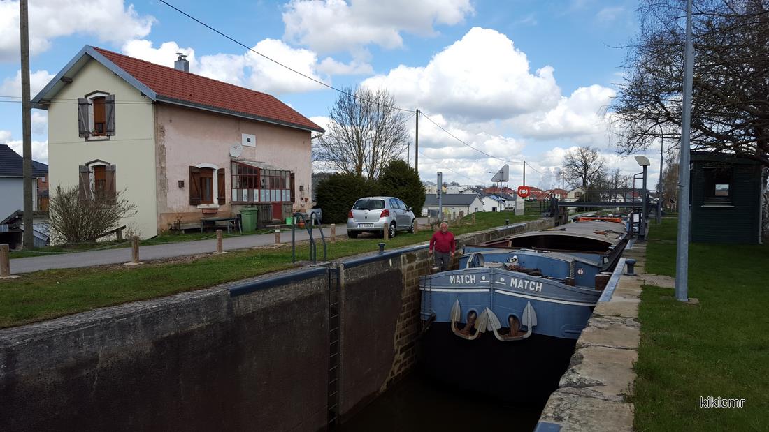 Après plus de deux ans amarré à Niderviller et un an et demi à Dombasle, le voici en route pour Arles, vers sa nouvelle vie de bateau-logement, vu à l'écluse 6 et bief 3 de la vallée de Golbey (88), sur le canal des Vosges :
