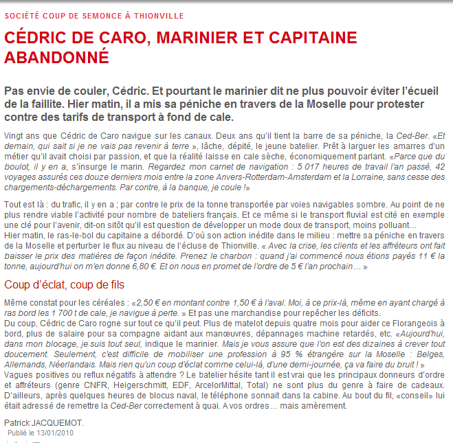 Des bateliers ont engagé un blocage de la navigation à Thionville : leur engagement nous concerne tous, et je vous propose: de recopier la lettre ci jointe en y mettant votre adresse et en la signant pour l'envoyer au Ministre et à toutes les personnalités politiques que vous connaissez (votre Maire, Conseiller Général, Député...) ainsi qu'à la presse locale si vous connaissez quelqu'un. Il faut que l'opinion publique prenne conscience que l'on existe et découvre ce qui se passe: il n'y a pour cela qu'un seul moyen, c'est de s'y mettre tous ! ! !