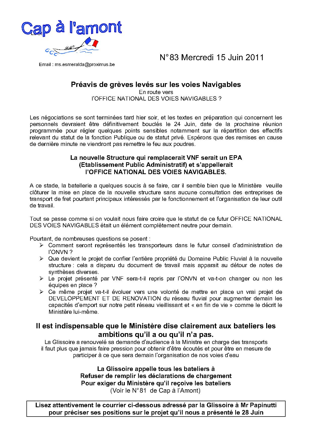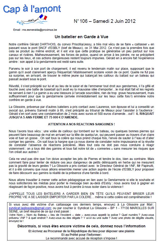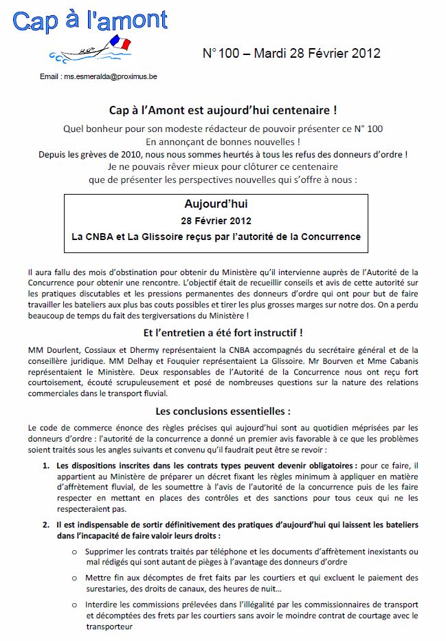 Le 17 Mai 2012 (voir Cap à l’Amont N° 105), Madame Nicole BRICK et Mr Fréderic CUVILLIERS étaient nommés Ministres en charge de nos problèmes. Le jour même, Le Syndicat La Glissoire leur envoyait un courrier pour demander à ce qu’une date soit fixée pour une audience afin de leur exposer les réalités de notre profession et savoir quelles étaient leurs intentions en direction du transport fluvial.