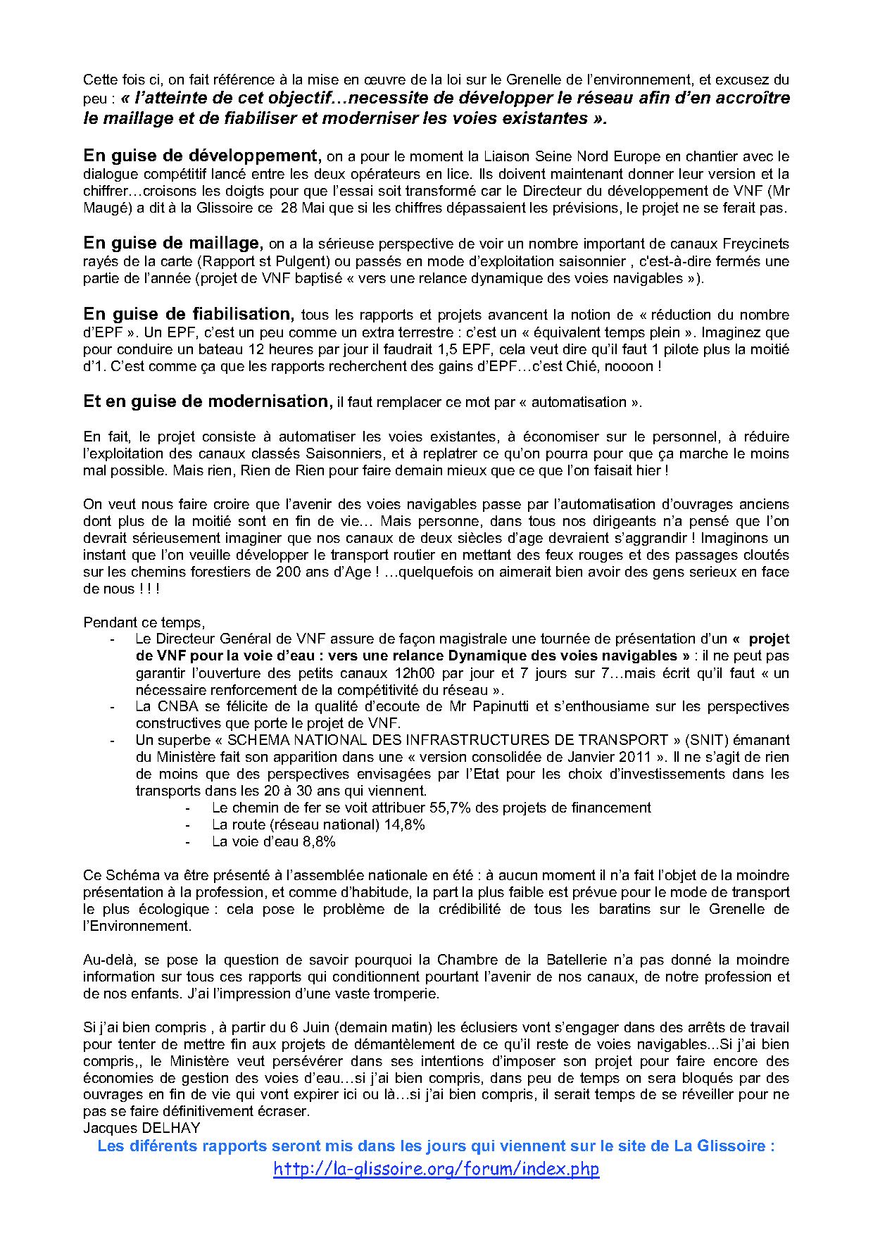 Le Secrétaire, Jacques Delhay apporte le résultat de la rencontre du 30 Mars : une délégation de La glissoire reçue par Mr Bourven, nouveau responsable des Voies Navigables à la direction des transports a soulevé CINQ questions essentielles: