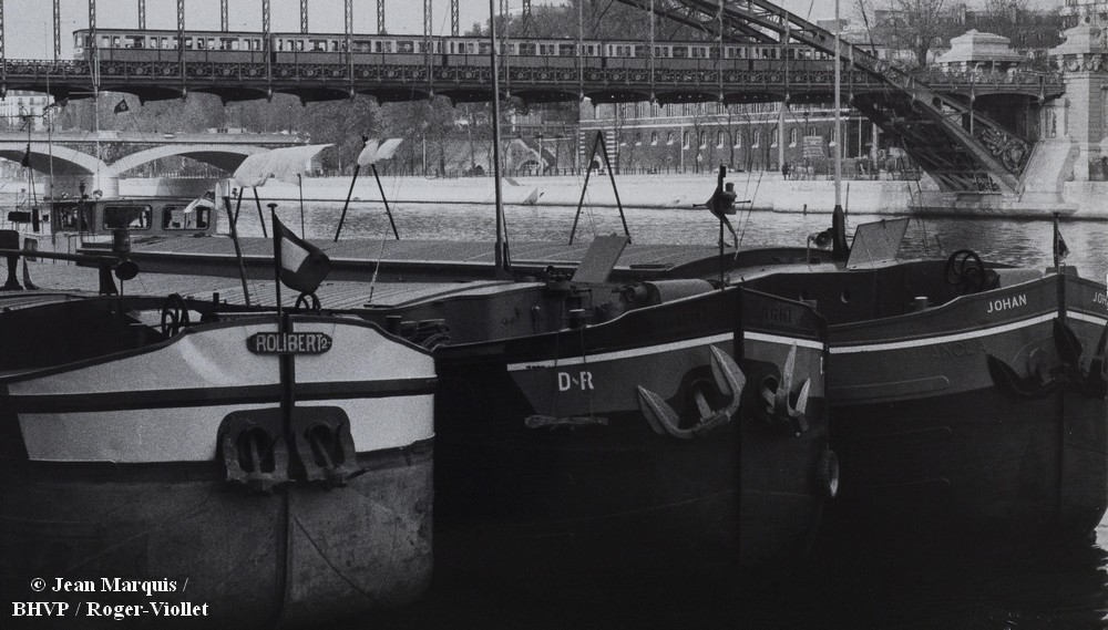 Sur le site bibliotheques-specialisees.paris.fr, on trouve cette photo de Jean Marquis (1926-...), photographe, dont le titre est « Le Viaduc du métropolitain d'Austerlitz ; vue prise vers le quai de la Rapée ; au premier plan des péniches amarrées port d'Austerlitz », sans date précisée :