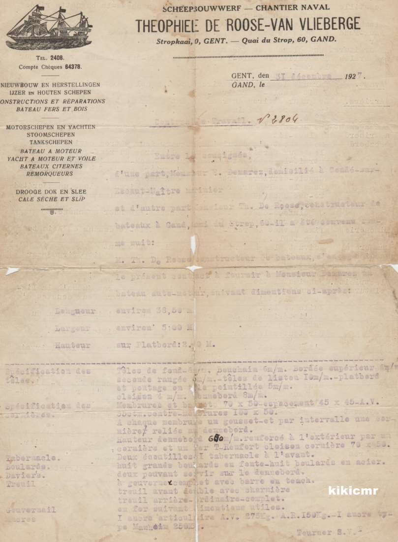 Arrêtons-nous sur ce qu'on peut lire, le chantier de construction. Le carnet de jaugeage indique qu'il a été construit à Ledeberg-les-Gand, ce que Guy a aussi dans ses relevés, et sur la promesse de vente, le nom du chantier est Pol de Roose, qu'on connaît surtout pour être situé à Melle, à quelques kilomètres de Ledeberg... Et j'ai eu la chance de voir le bon de commande originale du