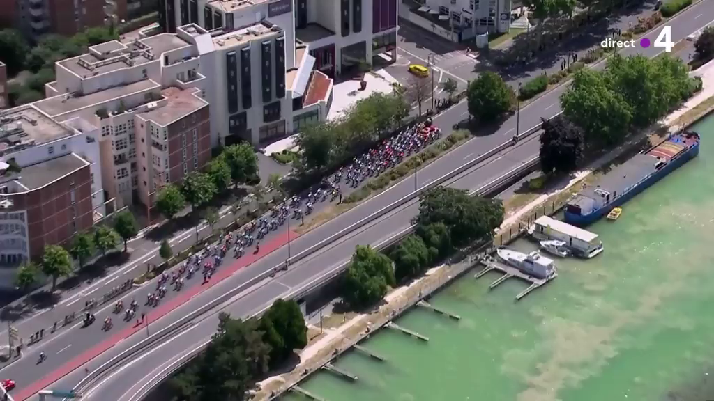 Si l'on en croit cette capture d'écran de la 4ième étape du Tour de France, le 9 juillet 2019, au départ de Reims, ce bateau est maintenant bleu :
