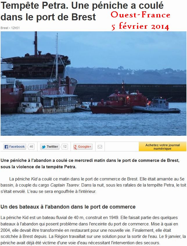 Construite en 1949, longue de 40 m, elle avait été mise sur un quai, il y a une dizaine d'années pour être transformée en péniche réception, restaurant et cabaret-spectacle. Le projet n'a finalement pas abouti et le Kid est resté scotché à Brest alors qu'il aurait dû être accueilli à Daoulas. Le 8 janvier dernier, le Kid avait embarqué une importante quantité d'eau, nécessitant l'intervention du bateau-pompe Douffine des marins pompiers.